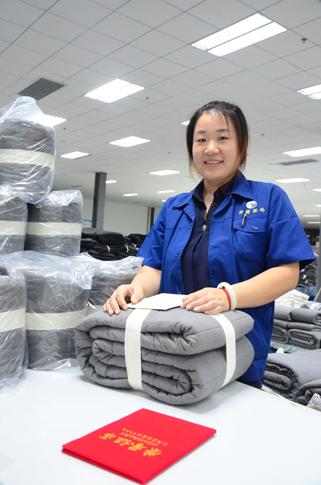 來(lái)自家紡成品車(chē)間的統(tǒng)計(jì)數(shù)據(jù)顯示,8月份,裁剪工段裁剪水洗被貨單計(jì)劃為15012件,實(shí)際完成18340件,效率提升22.1%;其中Q號(hào)絎棉每人每天計(jì)劃目標(biāo)完成184件,實(shí)際完成216件,效率提升17.55%;K號(hào)絎棉每人每天計(jì)劃目標(biāo)完成158件,實(shí)際完成199件,效率提升26.35%。縫制工段的生產(chǎn)效率相比7月份效率,提升了11.97%,返修率:0.17%。后整工段完成基數(shù)提升5%后再提升10%的目標(biāo),其中驗(yàn)整競(jìng)賽產(chǎn)量基數(shù)為294件/人/天,實(shí)際完成331.1件/人/天,效率提升12.62%,完成了提升10%的競(jìng)賽目標(biāo);包裝競(jìng)賽產(chǎn)量基數(shù)為147件/人/天,目標(biāo)產(chǎn)量161.7件/人/天,實(shí)際完成162件/人/天,提升了10.2%,完成了提升10%的競(jìng)賽目標(biāo)。