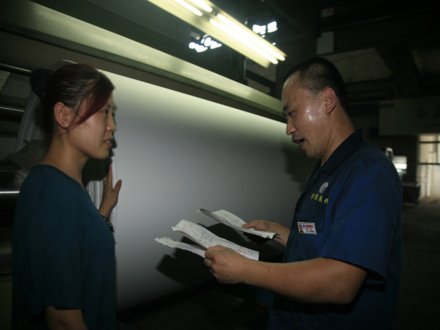 花一車間后處理技術員張延軍(圖右)與軋光機機長吳秀祝在交流生產情況。他倆表示,每一米優質產品都是靠專注認真干出來的。